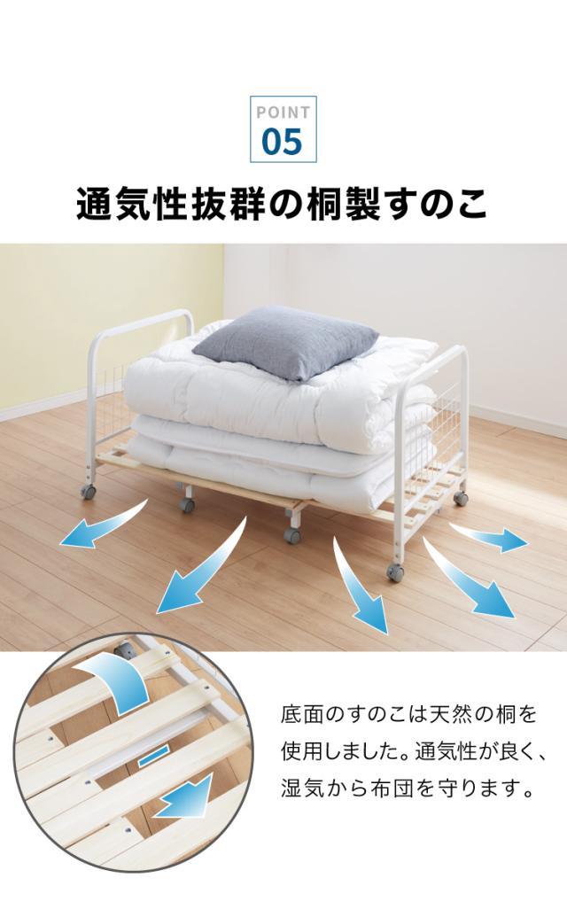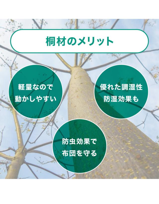 放湿性に優れた桐材すのこは、通気性に優れ湿気から布団を守ります。