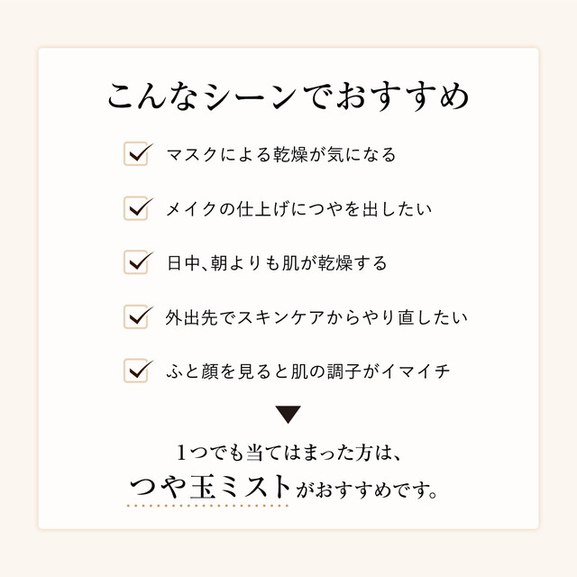 ○きめ細かいミストが、メイクの上からも、たっぷりのうるおいとなめらかで均一なハリを与え、瞬時に「つや玉」が輝く肌へ