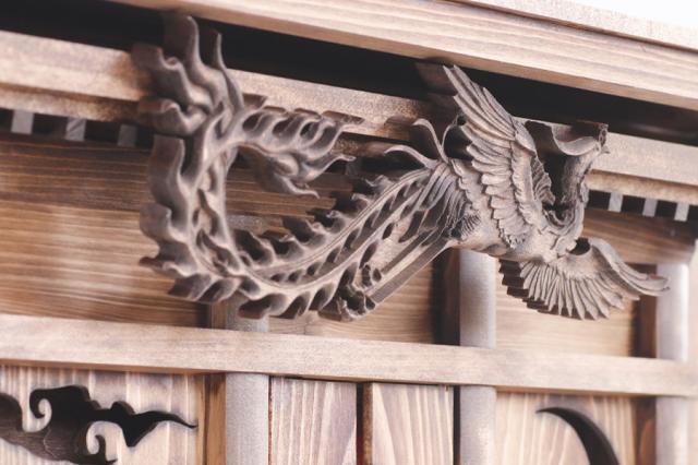 お社には、力強く優しく見守りくださる「鳳凰」が宿っています。天空を舞う不死鳥、永遠を表す象徴を細微な彫刻で表した、美しい神棚。奥行きを抑え、壁に掛けられるモダンなシルエットは、お神札を丁寧にお祀りする「箱宮」の新しいカタチ。