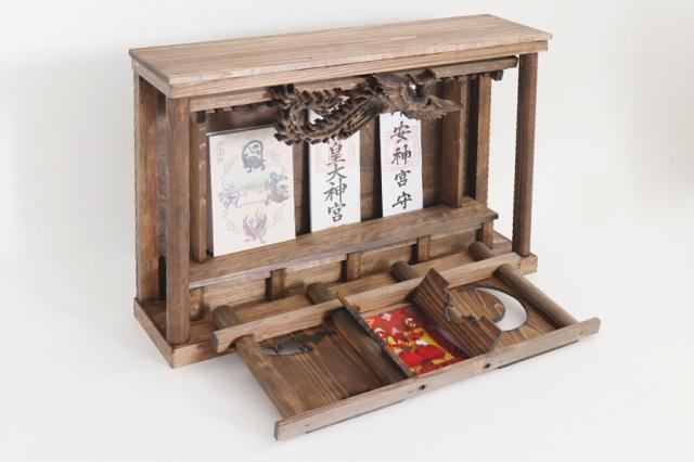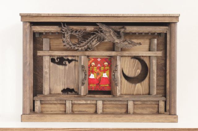 3枚までのお神札が収めやすい、三社宮の形構造となっています。一般のご家庭から店舗、事務所、会社などに適した、存在感のあるサイズ。壁掛け用フックが背面上部に付属しています。皆様の門出に合わせて華やかで豪華な祭壇を。「龍神」の彫刻をあしらった、同モデルの製品もございます。