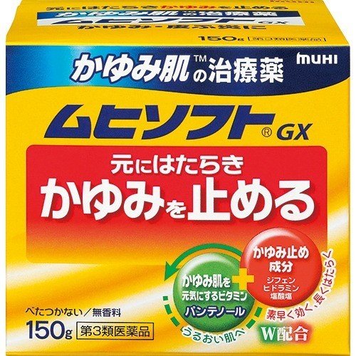 ムヒソフトGX かゆみ肌の治療薬 クリームは、かゆみ肌修復補助成分のパンテノールと、かゆみ止め成分の塩酸ジフェンヒドラミンを配合。乾皮症・乾燥によるかゆみに優れた効き目がある、クリームタイプの皮膚の薬です。