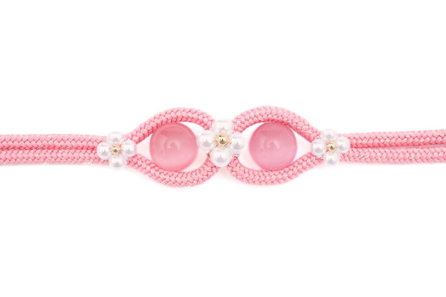 ラメのように輝く金属糸が組み込まれた組紐の中央には、花の形に象られたフェイクパールやガラス玉が帯留めのように施された、レトロなデザインです。