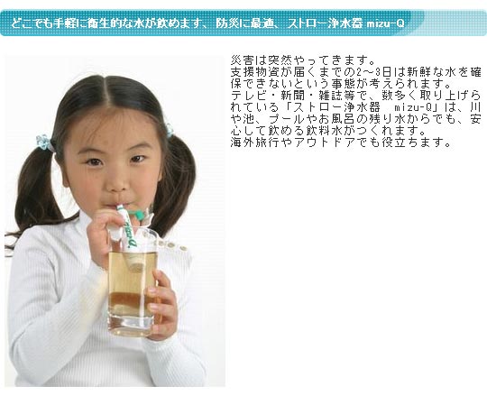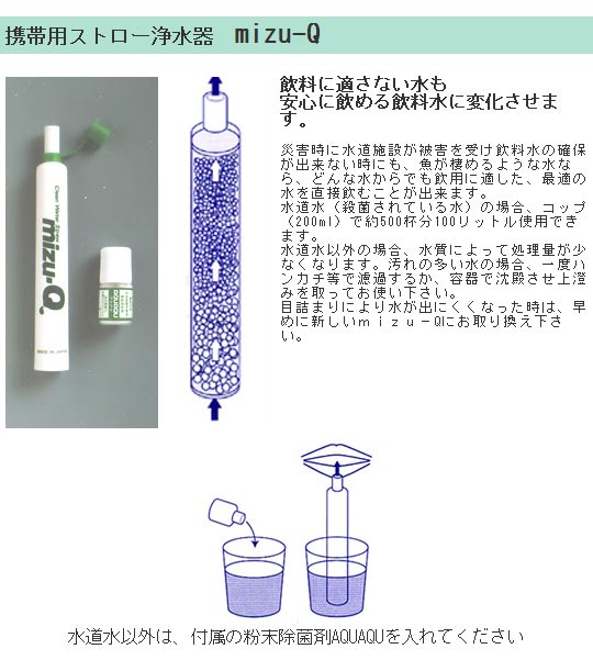 ストロー浄水器 mizu-Q ミズQ ミズキュー 災害 被災 地震 避難 避難所 遭難 飲料水確保 飲み水 浄化 自然水 飲用