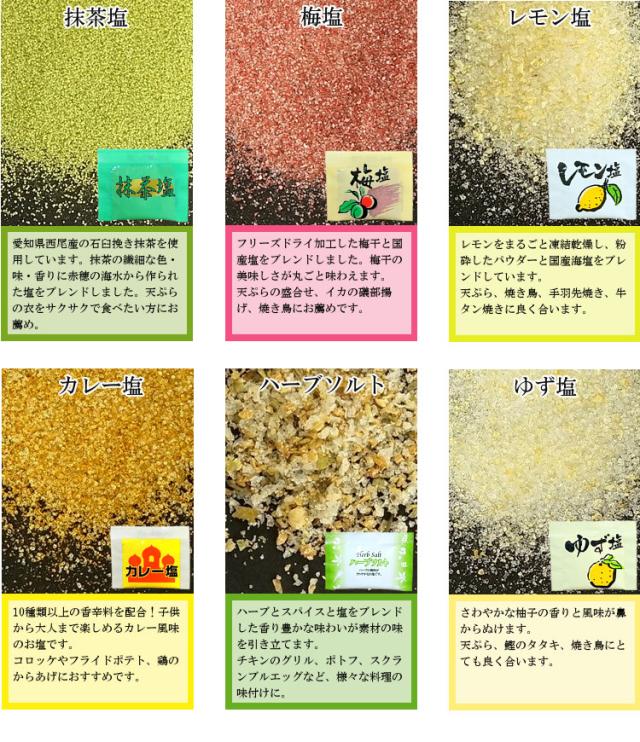- 塩ばかりのアソートですが、柚子や抹茶、梅、カレーなどバラエティーに富んでいて、お試しにはとても良いと思います。 味つけのない塩も産地の違うものが数種類入っていて、食べるのが楽しみです!