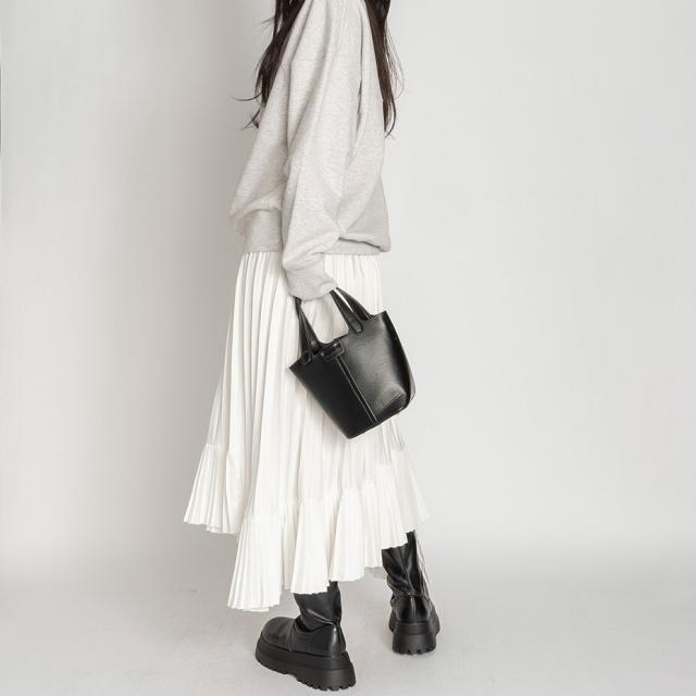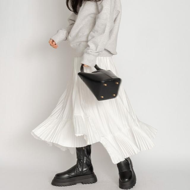 定番アイテムのプリーツスカートを切り替えアシメにアップデートしました。