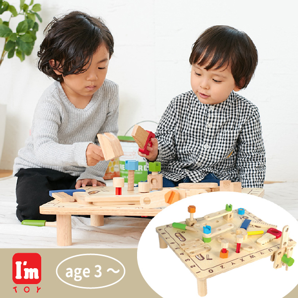| I'm Toy アイムトイ ABCカーペンターテーブル 名入れセット 男の子、女の子の1歳の誕生日プレゼント、クリスマスプレゼントにおすすめ。「握る」「つなげる」「通す」「結ぶ」といった指先の動きを追求して作られた木のおもちゃ、I’m TOY アイムトイシリーズです。 |