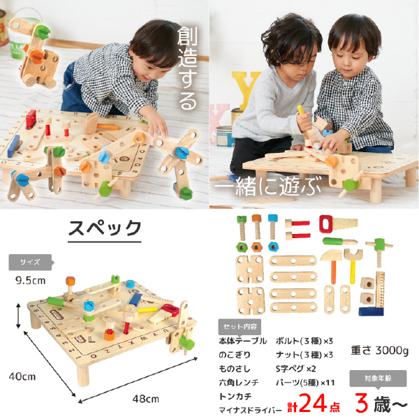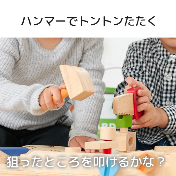 テーブルにトンカチやドライバ、レンチなどを使ってダイナミックに遊べる大工セット。