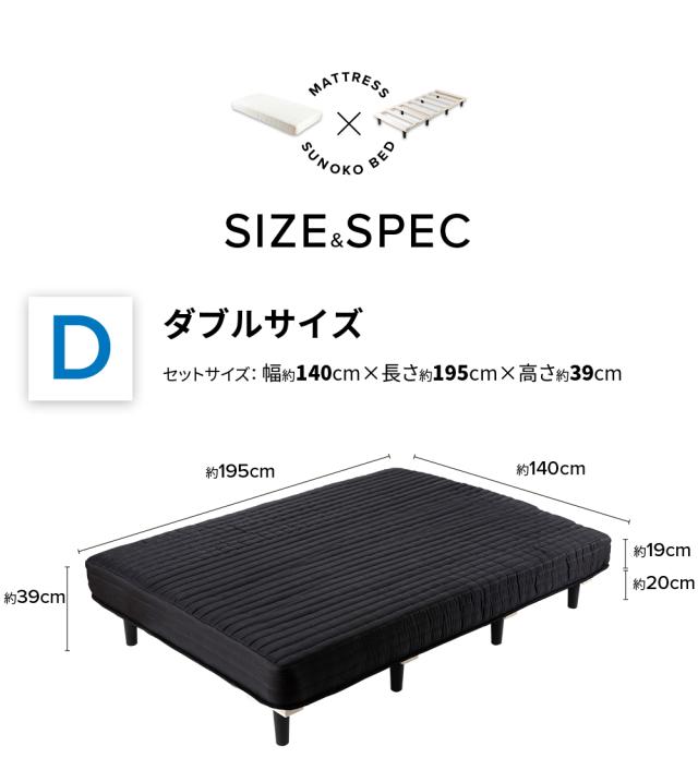 - いつか別のベッドに変える時、マットレスはそのまま使いたかったので、マットレスと脚部分が別になっているこちらの商品を購入しました。 マットレスと脚が入ってる箱が重くて二階に上げるのに、とても苦労しましたが、女1人で組み立てる事が出来ました!でも腰やりかけたので、届いてマットレス運ぶ時は2人がいいかと思います。 思ってたより脚部分がちょっと、そこまで丈夫そうじゃないなと思いましたが、欲しかったダブルベッドが安く手に入りましたし、体重が直接脚に負担がかかる訳でもないので大丈夫かなと思います! マットレスは柔らかめで、すのこ部分が縦180cm、横120cmでマットレスより小さめです!これは、ベッドのふちに足をぶつける心配がないので良いかもと思いました!ただ、1人で設置したのでマットレスがズレましたw マットレスの裏面が全面、すのこについてるマジックテープにくっつく素材なので1人では直せなかったので、今度友人に手伝ってもらいます! コロナで多忙な中、迅速な対応ですぐ届きました!ありがとうございました!