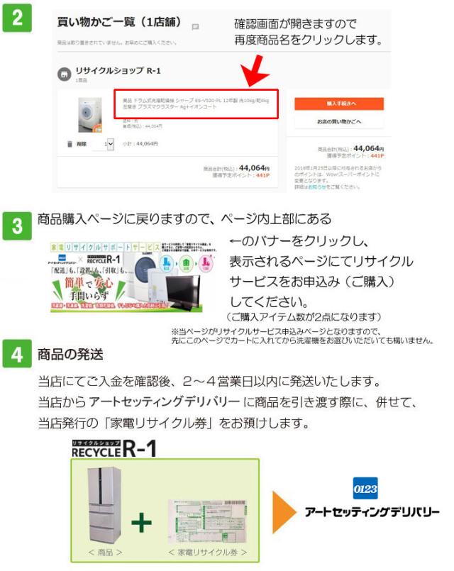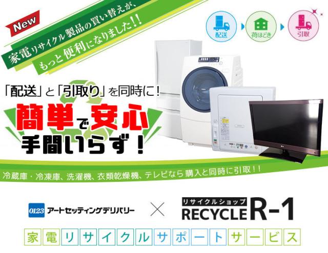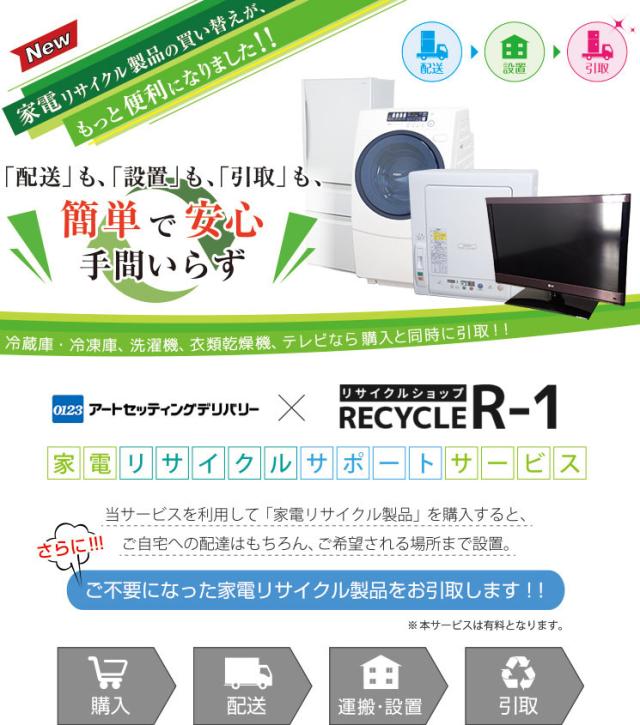 【オプションサービス】 ※こちらのサービスは弊社にてリサイクル対象商品のご購入と同時にお申込みいただけるサービスです。 弊社で購入した商品をお届けの際に、ご自宅にある不要の同一商品を引取るサービス です。 弊社にてアートセッティングデリバリーへ手配をいたしますので、楽チン!。 ご希望の時間に配達、引取を行います。(地域により対応できない場合もあり) 【注意】 ・こちらはお申込みサービス料のみとなります。 ・引取時にアートセッティングデリバリーのリサイクル査定額と運搬料(引取商品分)の金額を その場で現金にてお支払ください。 ※このサービスでの設置とは、お客様のご希望の場所までの設置です。 洗濯機等の配管等に関しましては、別途「設置オプション」のお申込み(有料)が必要です。 詳しくはお問い合わせください。 | |