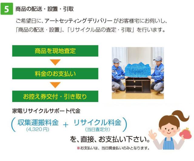 ●当サービスは、家財おまかせ便の商品かつリサイクル家電の製品のみに有効。 です。日本通運、佐川急便、ゆうぱっく指定の商品にはお使いいただくことができませんので ご注意ください。 ●家電リサイクルサポートサービスをご依頼の場合に限り、家財おまかせ便への変更 を承ることが可能です。その際は、各商品ページ内記載している料金表とは異なりますので、 当店までお問い合わせ下さい。 ●対象の製品は、冷蔵庫・冷凍庫、洗濯機・衣類乾燥機、テレビのみとなります。 ※ エアコンは対象外となりますのでご注意ください。 ●引取が可能な家電リサイクル製品は、ご購入製品と同品目に限ります。 ●当サービスをご利用いただく場合は、「当サービス料」「収集運搬料金」「リサイクル料金」 がかかります。 ●リサイクル料金は、メーカーや製品の大きさによって異なります。。 配送日当日に正式なリサイクル料金が確定致します。 事前にご料金をお調べしたい場合は、こちらからお願い致します。 ●リサイクル品の回収時、通常の搬出ができない場合には追加料金が発生します。 ●当店にてご注文内容を確認後、メールもしくはお電話にて詳細をご案内させていただきます。 ●「家電リサイクルサポート代金」につきましては、配送・引取当日に、アートセッティングデリバリーのスタッフへ直接、 現金でお支払いください。 |