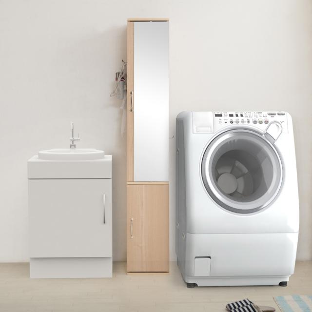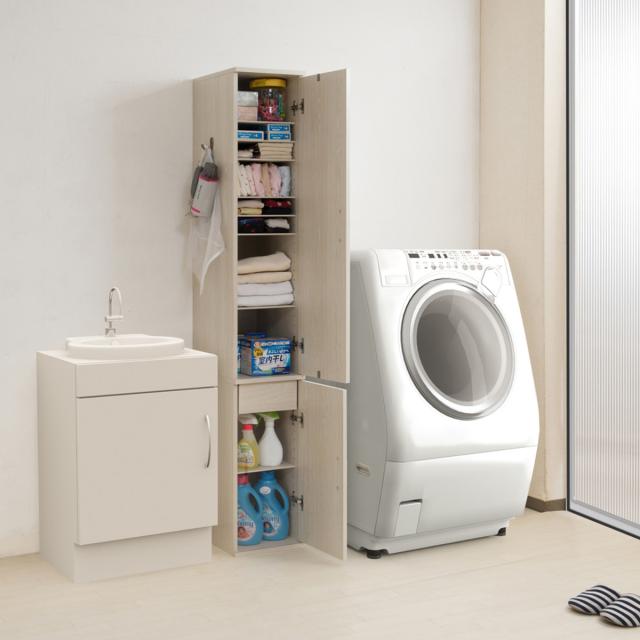 うっすらと見える木目からぬくもりが感じられ、特徴的な取っ手がアクセントのお洒落なランドリーラックです。ミラー付きのスリムなデザインで、雑多なものを隠してすっきりとしたランドリースペースを演出してくれます。