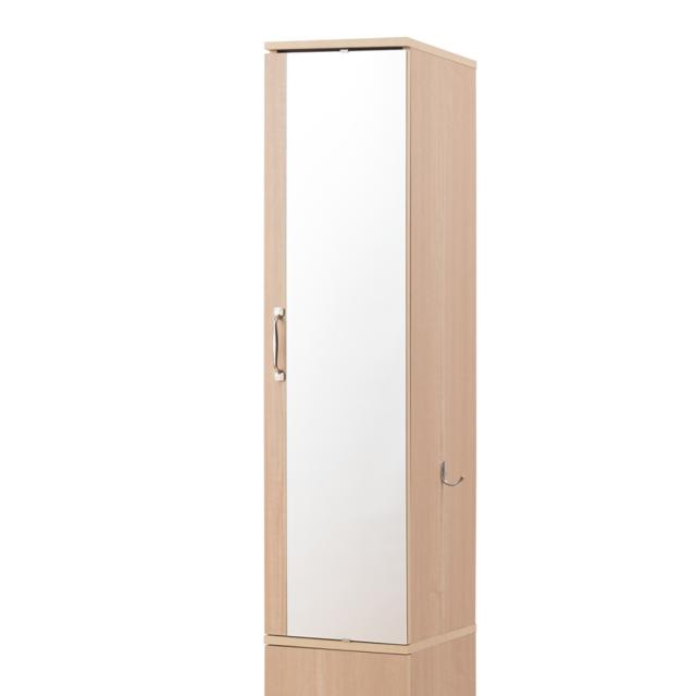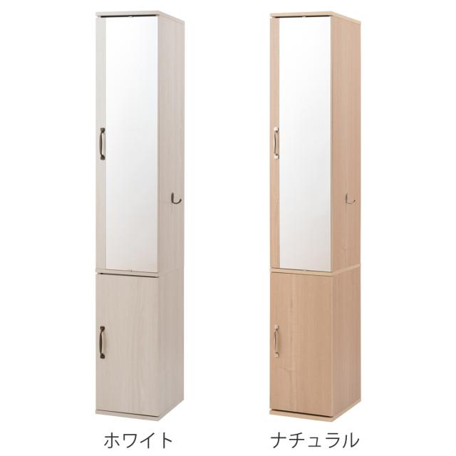 約幅27cmの隙間に置けるスリムな設計でありながら、ミラー・引出し・フックなど色々な機能を兼ね備えている、使い勝手の良さがポイントです。