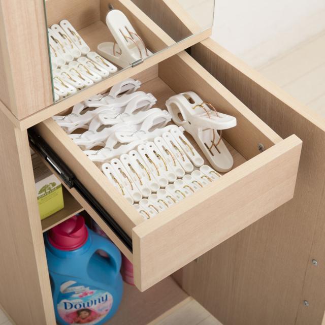 扉の中には小物収納に便利な引出し付きです。スライドレール仕様なので開閉もスムーズです。