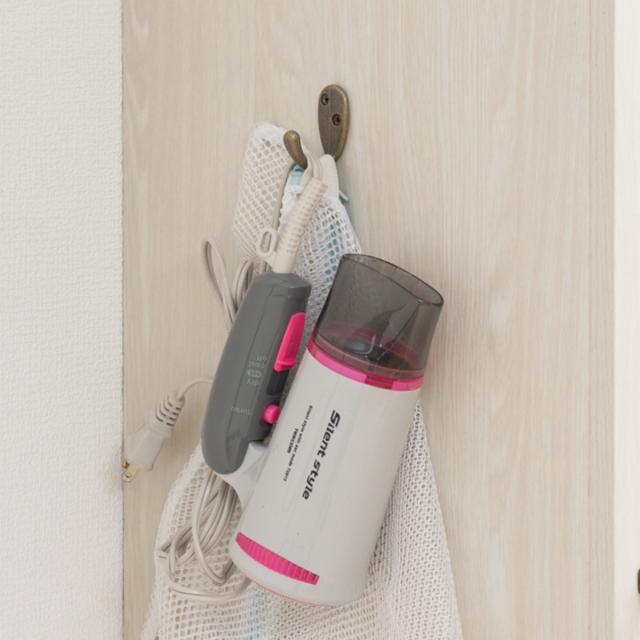 フックが2個付属しています。お好きなところにつけることができ、ドライヤーや洗濯ネットなどを掛けておけるので便利です。