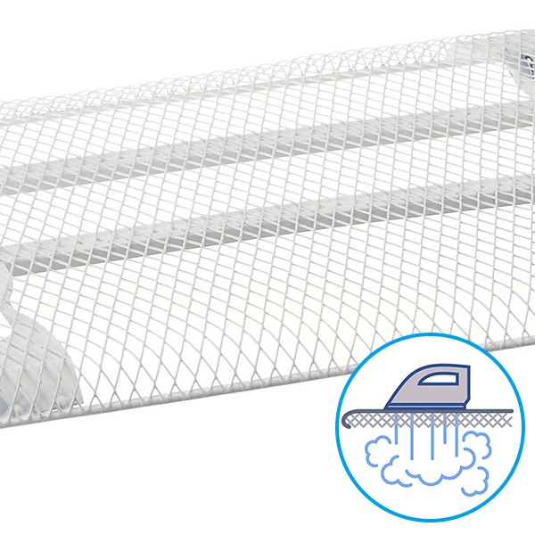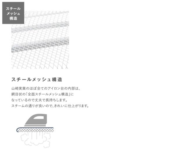 軽量構造軽さを追求した、新開発の軽量構造なので、女性でもラクに持ち運びや出し入れを行うことが出来ます。 | スチールメッシュ構造本体は大変丈夫なスチール製で熱による歪みなどが生じにくいです。また、メッシュ構造なのでスチームの通りがよく、パリッときれいに仕上がります。 |