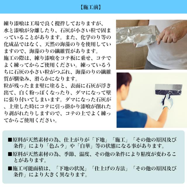 粒が残ったまま壁に塗ると、表面に石灰が浮き出て、白く粉っぽくなったり、ダマになって壁に張り付いてしまいます。ダマになった石灰が、上塗した時にコテに引っ掛かり漆喰が削れたり剥がれたりしますので、コテの上でよく練ってからご使用ください。
