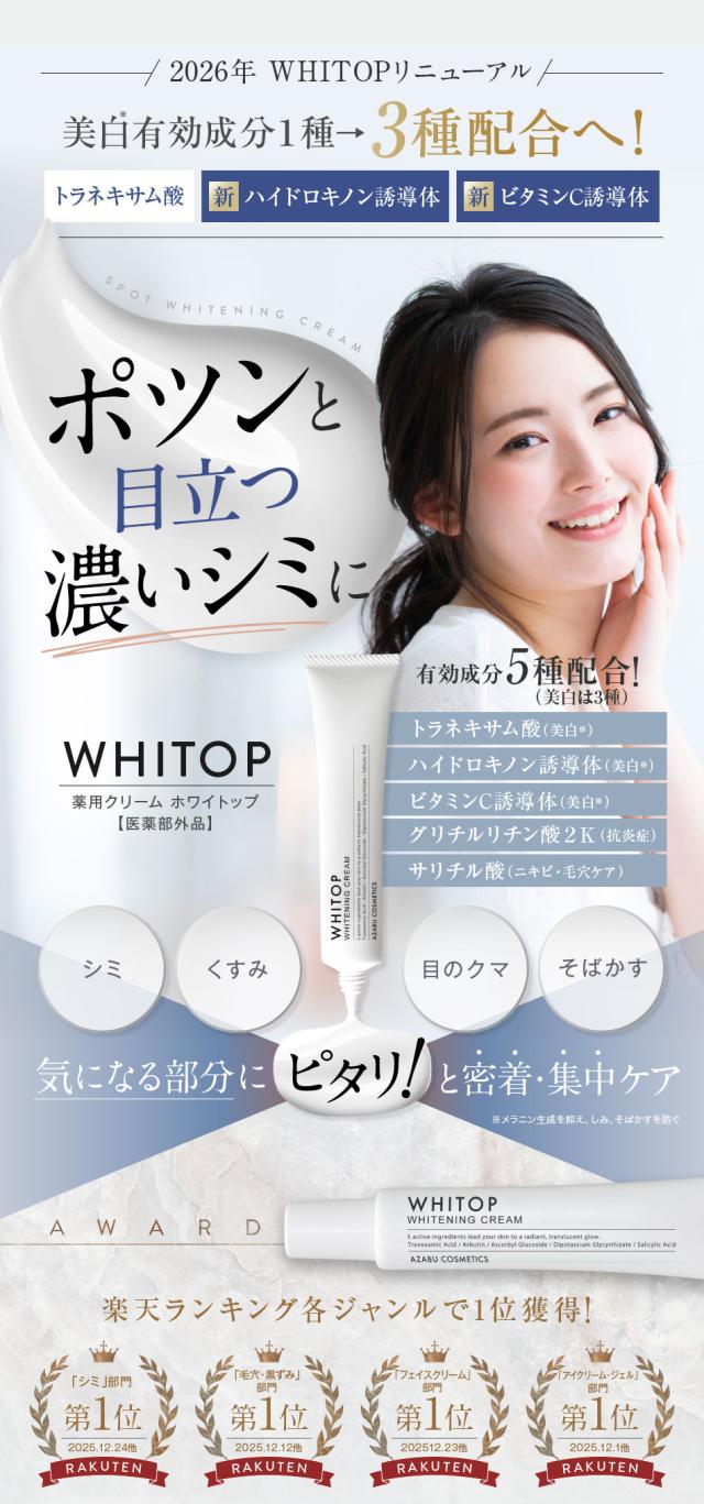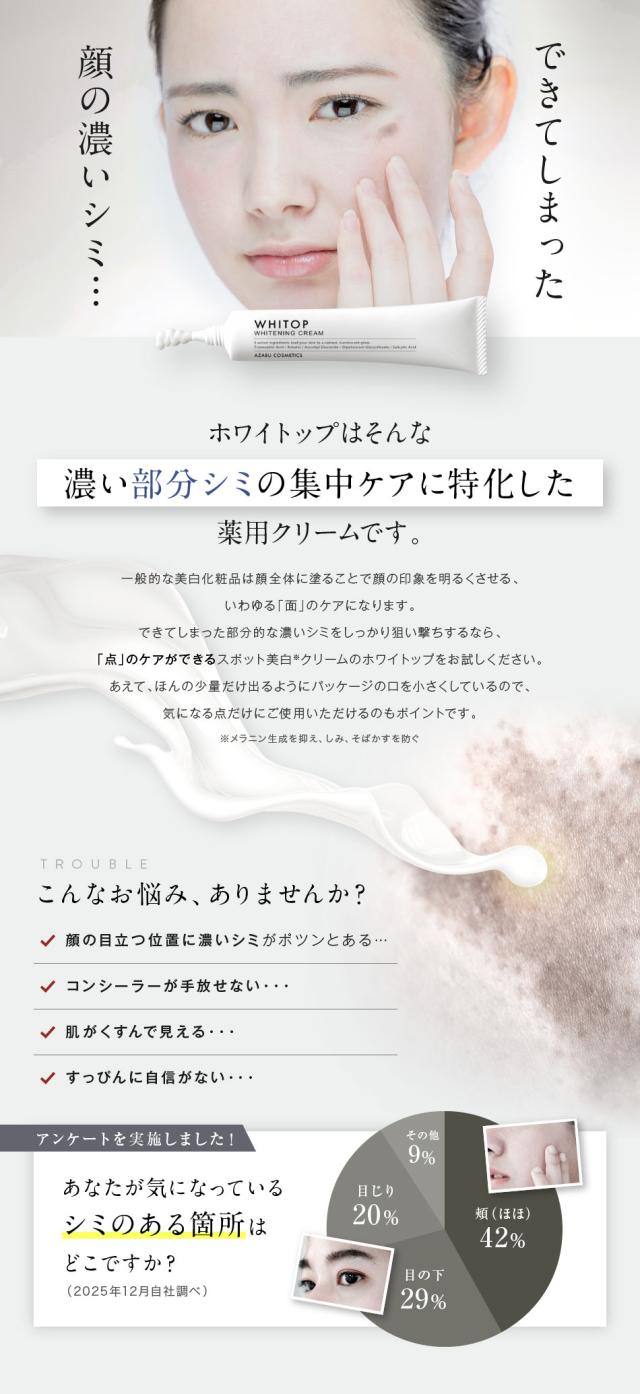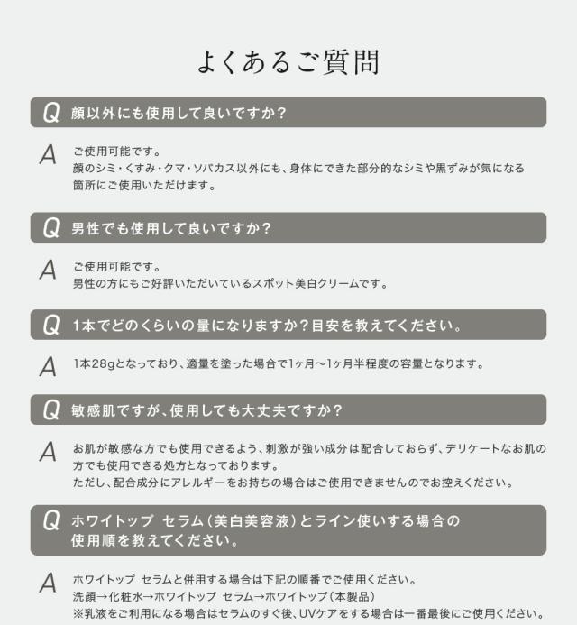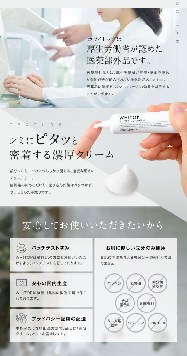 【予約販売/リニューアル版】 美白クリーム 顔にできてしまった濃いシミに ホワイトップ 28g トリプル美白有効成分配合 トラネキサム酸、ハイドロキノン誘導体、ビタミンC誘導体 シミ消し シミ取り シミ くすみ 肝斑 部分シミのケア スポット美白 シミの漂白剤