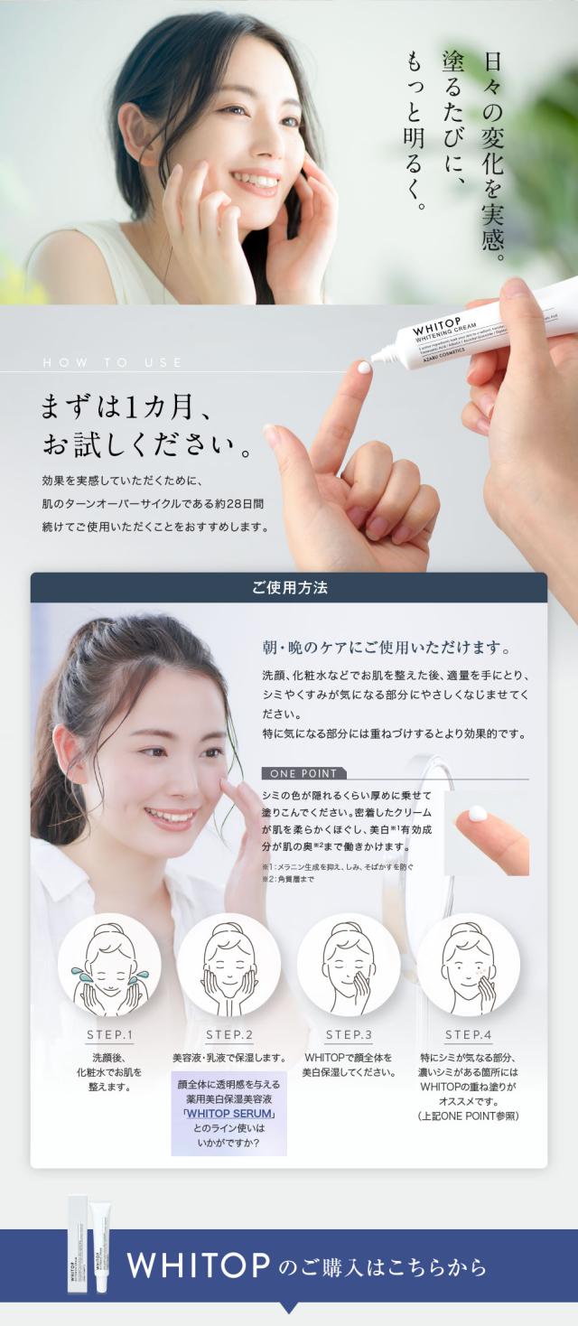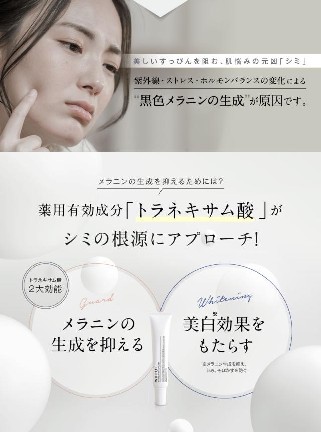 美白クリーム 美白 クリーム ケア 予防 消す 顔 シミ 黒ずみ くすみ そばかす 目の下 目元 くま 肌荒れ 肝斑 ニキビ ニキビ跡 トラネキサム酸 ハイドロキノン ビタミンC 誘導体メラニン シミ消し シミ取り シミの漂白剤 薄く 改善 解消 ホワイトップ 色素 沈着 保湿 透明肌 美肌