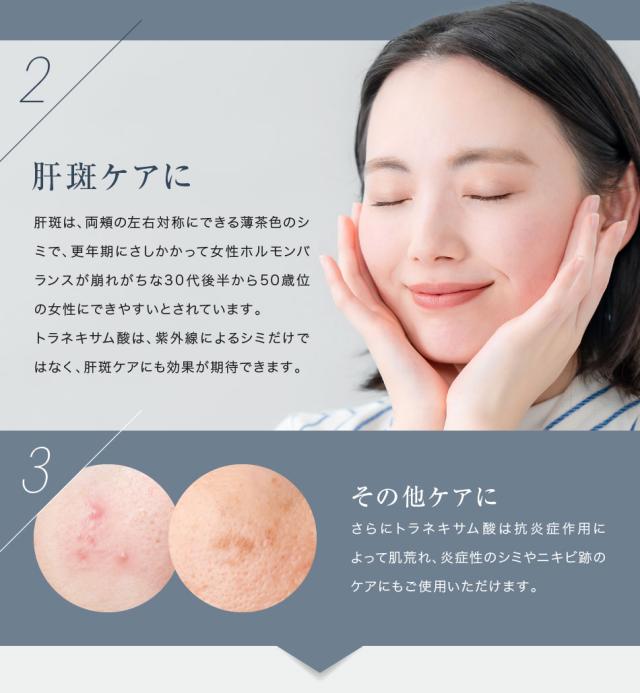 ●美白に特化した3種の有効成分配合。できてしまったシミ対策に美白効果の高い「トラネキサム酸」「ハイドロキノン誘導体」、長期間に渡り顔に透明感を与える「ビタミンC誘導体」を配合。