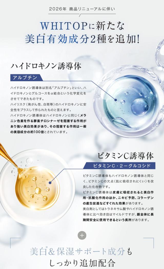 ●有効成分2種→5種へ。美白有効成分は1種(トラネキサム酸)→3種(トラネキサム酸、ハイドロキノン誘導体、ビタミンC誘導体)へ