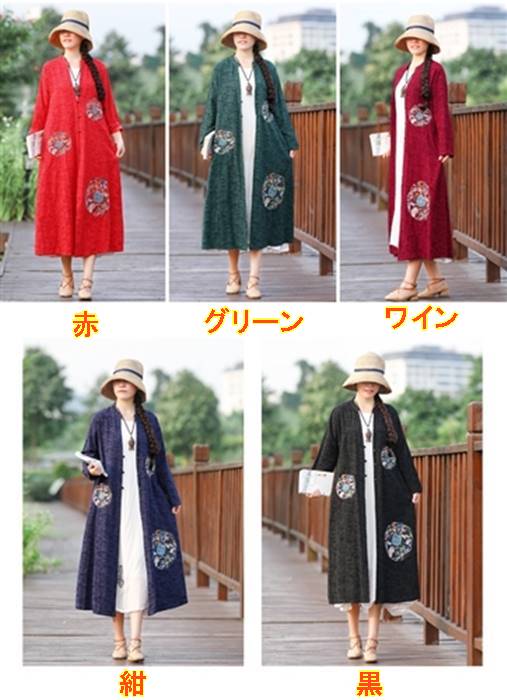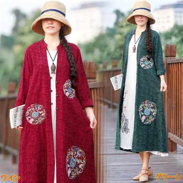 エレガント チャイナドレス風 レディース ロング アウター花刺繍 ワイン色