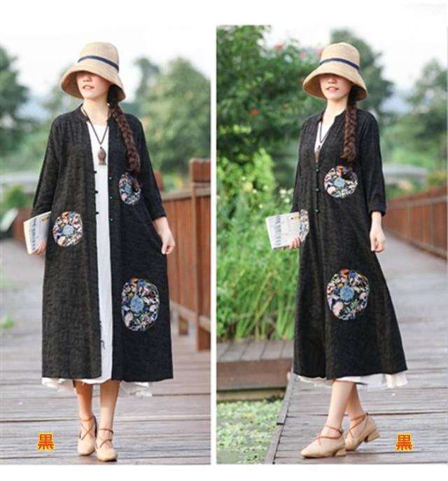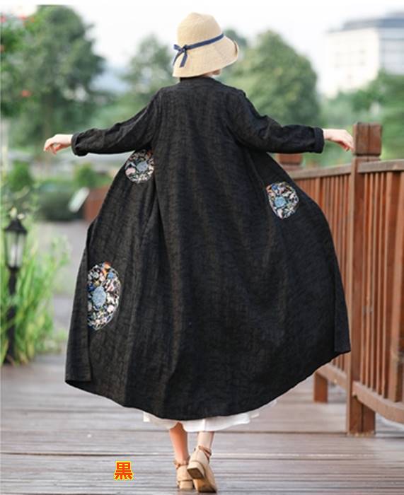 エレガント チャイナドレス風 レディース ロング アウター花刺繍 黒色