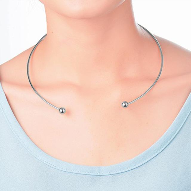 ボディーピアスのサーキュラーバーベル型のシンプルな細身のバングルタイプのステンレスネックレスです。細身で個性を発揮できるおしゃれな銀色シルバーカラーのステンネックレス。ネックレスチェーン等とは違って、固定タイプのチョーカーは、上品なスタイルをアシストしてくれる。ドレッシーなスタイルと高級感のあるステンレスの素材感が大人の女性を演出してくれる。ペンダントトップを通してつかったり、シンプルなネックレスチェーンとの重ね付けしたり、使い方は自由自在のオススメのジュエリー。シンプルですが個性的なチョーカーが存在感を発揮してくれます。ステンレス製なので、つけっぱなしでも劣化しにくい。カジュアルなスタイルだけでなくスーツなどのフォーマルなスタイルにもバッチリきまるネックレスです。メンズでもレディースでも使えるのでペアルックやプレゼントにもオススメ!