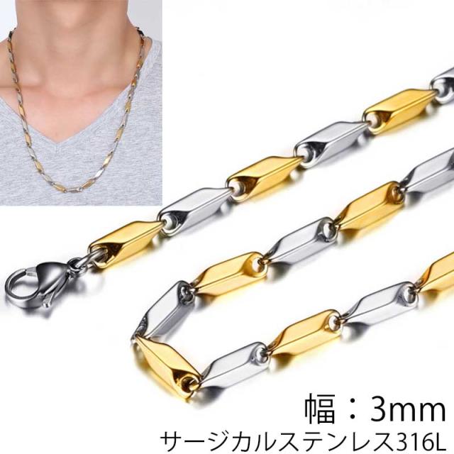 [サージカルステンレス316L製 ネックレスチェーン] ゴールドミックスグレイブストーンチェーン (太さ:3mm) 細め 細い スリム ステンレスチェーン チョーカー メンズ レディース プレゼント ギフト 男の人 女の人 銀色 シルバー 3ミリ 3.0mm おしゃれ 鎖 クサリ 金色 2色