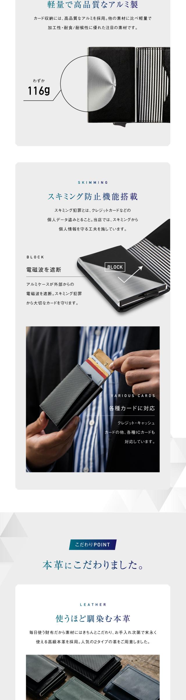 中央アルミカードケースに備わった機能で、電磁波を利用した非接触型のデータを盗み取る犯罪から個人情報を守ります。