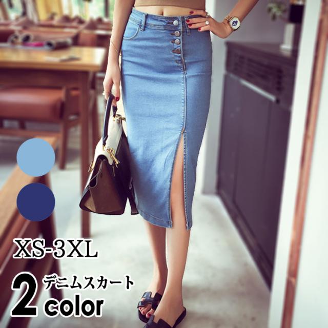 デニムスカート レディース デニム スカート スリット 膝丈 ひざ丈 ミモレ丈 タイト ハイウエスト スリム フロントボタン ストレッチ 春 夏 秋 冬 大きいサイズ シンプル 無地 大人 きれいめ セクシー カジュアル おしゃれ かわいい ブルー
