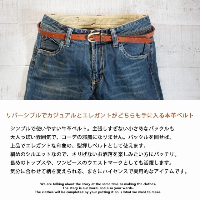 シンプルで使いやすい牛革ベルト。主張しすぎない小さめなバックルも大人っぽい雰囲気で、コーデの邪魔になりません。バックルを回せば、上品でエレガントな印象の、型押しベルトとして使えます。細めのシルエットなので、さりげないお洒落を楽しみたい方にバッチリ。長めのトップスや、ワンピースのウエストマークとしても活躍します。気分に合わせて柄を変えられる、まさにハイセンスで実用的なアイテムです。