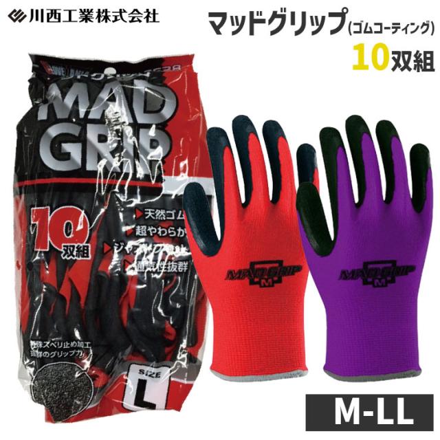 手袋 マッドグリップ10双組 2638-75 メンズ ユニセックス レッド パープル 大容量 お得 天然ゴム 柔らかい 通気性抜群 作業用 普段用 一般作業 土木 建築 運送 DIY
