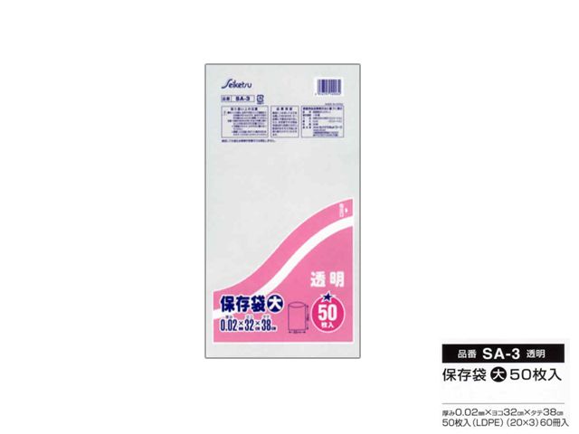 ●台所用保存袋 大サイズ●色:透明●厚み0.02mm ヨコ幅32cm タテ幅38cm●材質:LDPE(低密度ポリエチレン)●袋の素材は透明度が高く柔らかく伸びるのが特徴です●透明度が高く中身が良く見えます製品名:台所用保存袋 大(LDPE)型番:SA-3メーカー:株式会社セイケツネットワーク【商品キーワード】ごみ袋 ゴミ袋 ポリ袋 保存袋 手さげ袋 買い物袋 ビニール袋 傘入れ袋 指定袋 規格袋 レジ袋