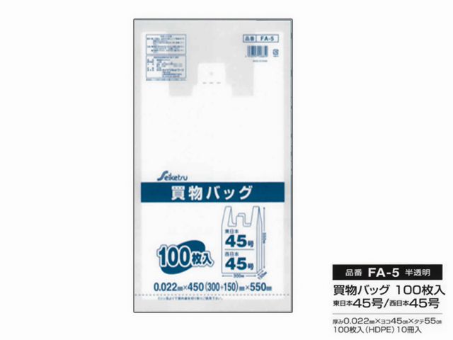 ●買い物バッグ レジ袋 東日本45号/西日本45号●厚み0.022mm ヨコ幅45cm(幅30cm/マチ15cm) タテ幅55cm●色:半透明乳白色●材質:HDPE(高密度ポリエチレン)●袋の素材は引っ張り強度が強く、耐熱・耐薬品性・耐ガスバリア性に優れます●透明度が低くレジ袋のようにカサカサした感触が特徴です製品名:買物バッグ乳白色タイプ(HDPE)東日本45号/西日本45号型番:FA-5メーカー:株式会社セイケツネットワーク【商品キーワード】ごみ袋 ゴミ袋 ポリ袋 保存袋 手さげ袋 買い物袋 ビニール袋 傘入れ袋 指定袋 規格袋 レジ袋