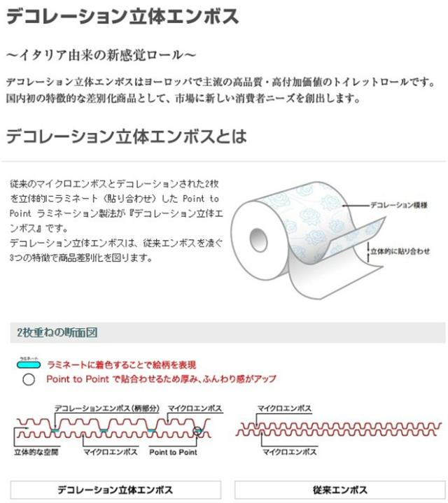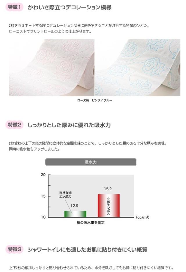 ●デコレーション立体エンボスでふんわり感がアップ●ロール部分にはピンクの立体的なバラ柄デコレーション入り●優れた吸水力でシャワートイレに最適です●爽やかな香り付き●蛍光染料は使用しておりません 【商品詳細】ロールサイズ:114mmX25m(ダブル)材質:再生紙100%色・表面:デコレーション立体加工香り:さわやかな香り絵柄:花柄プリント芯:有りミシン目:有り内容量:12ロール入りX8パックケース寸法:820X410X352mm製造メーカー:春日製紙工業株式会社【商品検索キーワード】業務用トイレットペーパー,トイレットペーパーダブル,トイレットペーパーシングル,芯無しトイレットペーパー,ウオッシュレット用トイレットペーパー,香り付きトイレットペーパー,トイレットロール,カラートイレットペーパー