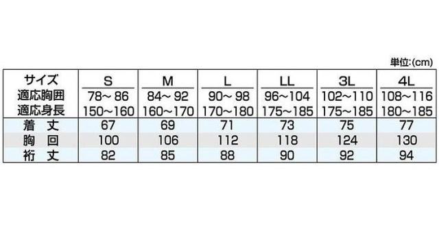 LL:適応胸囲:96〜104cm 適応身長:175〜185cm 適応胴囲:86〜96cm