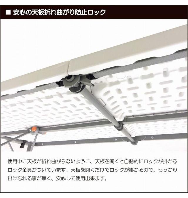 使用中に天板が折れ曲がらないように、天板を開くと自動的にロックが掛かるので、掛け忘れがなく安心して作業できます。使わないときも、折りたたみ式なので収納スペースに困りません。