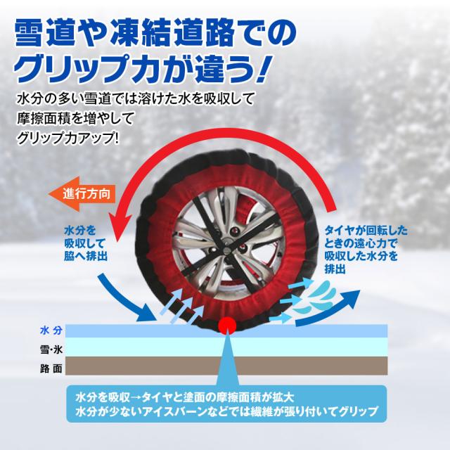 従来品より簡単にタイヤに装着可能、煩わしいジャッキアップの必要がありません。急な降雪でも素早く取り付けできます。また、ホイールを覆うように十字状のベルトも付いており、走行安定性の向上や取り外すときに役にも立ちます。 - 振動が少なく、滑らかな乗り心地で凍結にも牽引力を発揮