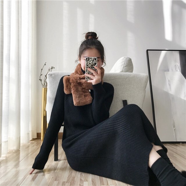 LAZA (ブラック) レディース ニットワンピース タートルネック 長袖 ロング丈 ニット ワンピース Iライン