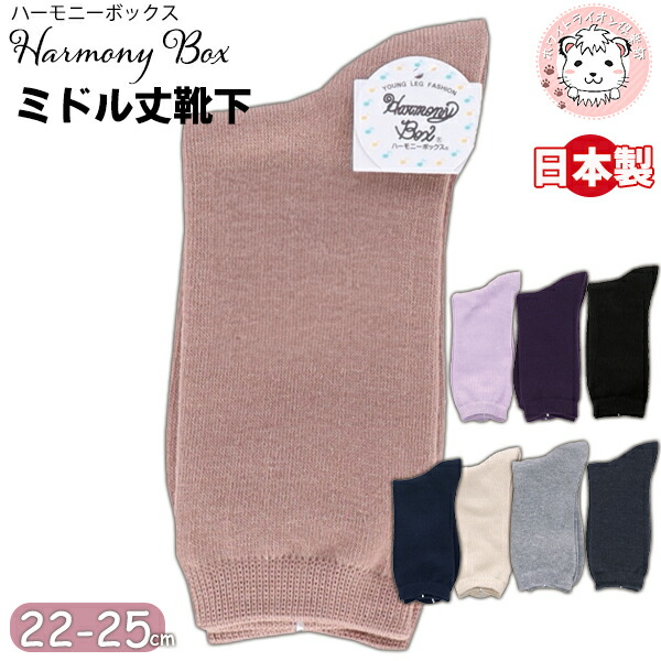 ハーモニーボックス 平編み カラーソックス ミドル丈 スクールソックス 日本製 22-25cm | レディース ソックス 靴下 クルー丈 ベタ編み つま先補強 かかと補強