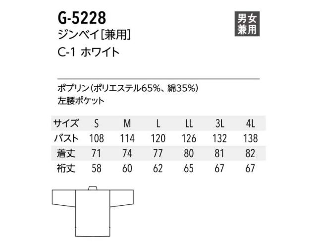 飲食サービス系ユニフォーム アルベ arbe チトセ chitose兼用 ジンベイ G-5228 通年