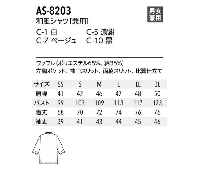 飲食サービス系ユニフォーム アルベ arbe チトセ chitose兼用 和風シャツ AS-8203 通年