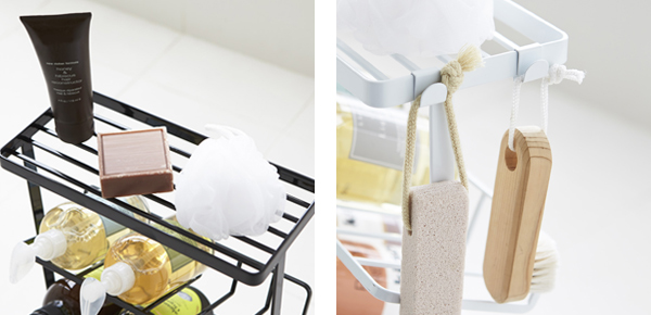 | 上段には小物を置ける 上段には石けんやチューブなどの小物を収納しておけます。 | フック付き 本体と同色のフック付きです。洗顔ネットやブラシなどを掛けておくのに便利です。 |