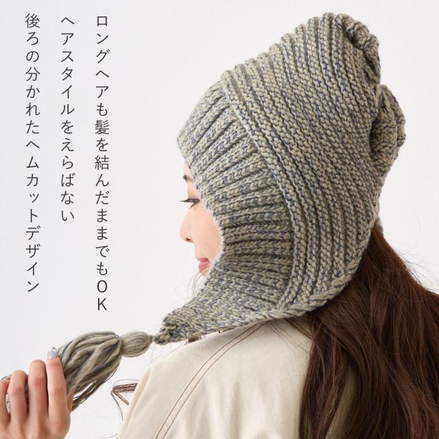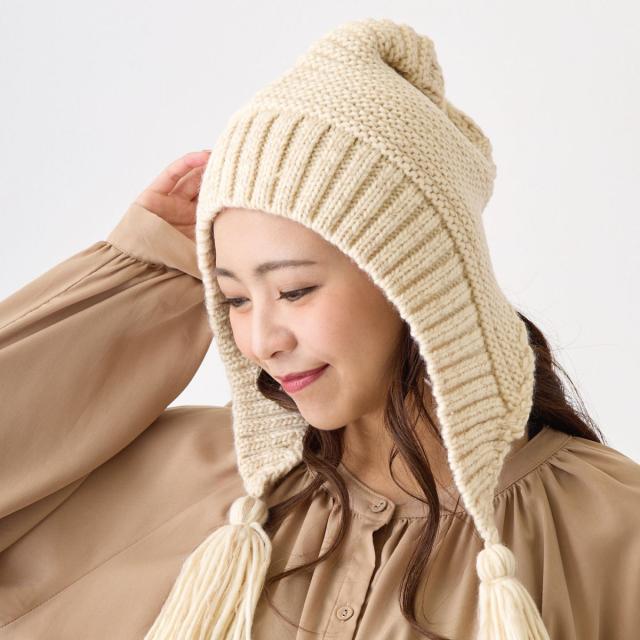 冷たい空気から耳まで守ってくれる暖かさと毛糸のボリュームたっぷりな太めタッセルで小顔効果も抜群!