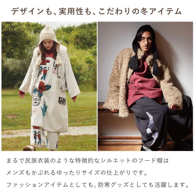 まるで民族衣装のような手編みニット帽は、メンズもかぶれるゆったりサイズの仕上がり。