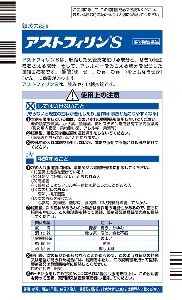 アストフィリンSは、収縮した気管支を広げる成分と、せきの発生をおさえる成分、そして、アレルギーをおさえる成分を配合した鎮咳去痰薬です。「喘鳴(ぜーぜー、ひゅーひゅー)をともなうせき」「たん」に効果があります。アストフィリンSは、飲みやすい糖衣錠です。