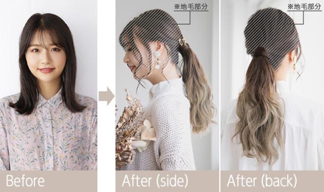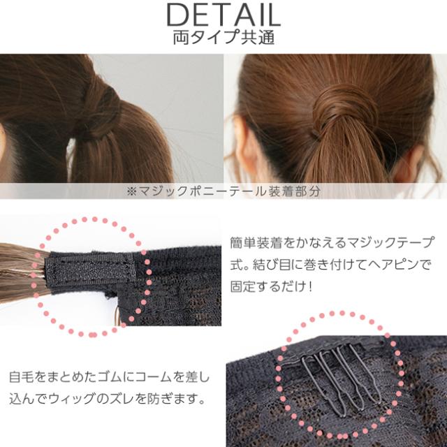 人気のポニーテールウィッグが、長さとボリュームを抑えてより扱いやすく、幅広い方に使っていただきやすくなりました。もちろんマジックテープで巻きつけるだけの簡単装着。セミロングの長さでアレンジもしやすく、巻き付ける部分も自然な仕上がりに!自然に馴染む単色4色と、境目のない自然な染色が好評のグラデーションカラー9色展開とカラバリの豊富さも魅力。ゆるカール、ウェーブの2typeから選べます。