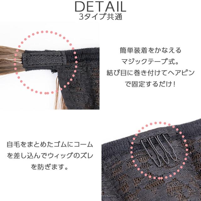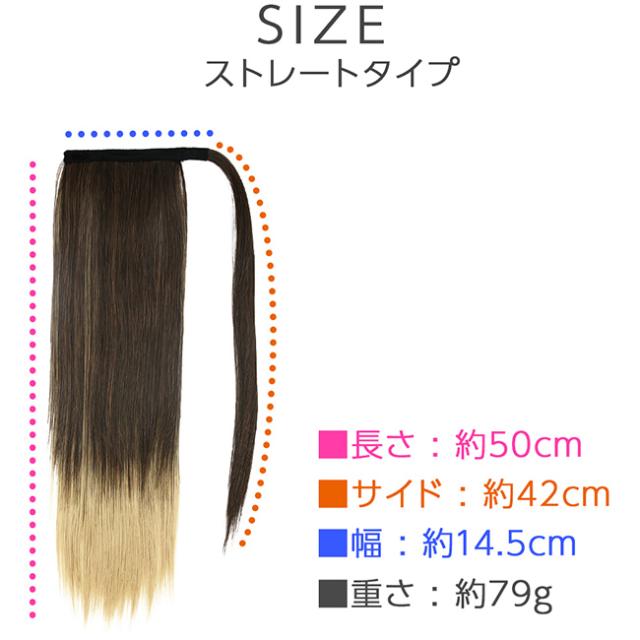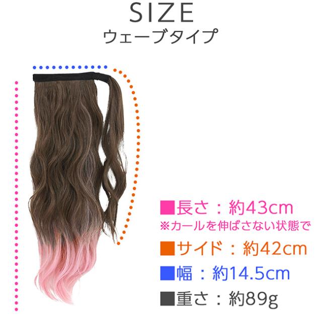 | 髪の長さ | [ゆるカールタイプ] 約46cm マジックテープ:約14.5cm サイド:約39cm [ウェーブタイプ] 約43cm マジックテープ:約14.5cm サイド:約42cm [ストレートタイプ] 約50cm マジックテープ:14.5約cm サイド:約42cm |
