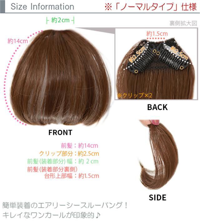 | 髪の長さ | ノーマルタイプ(hf173):前髪約14cm 前髪幅(装着部分)約2cm クリップ部分約1.5cm×2 サイドバングタイプ(hf174):前髪約15cm 前髪幅(装着部分)約3.5cm 横髪(サイド)約24cm、クリップ部分約3cm×1 |