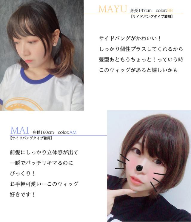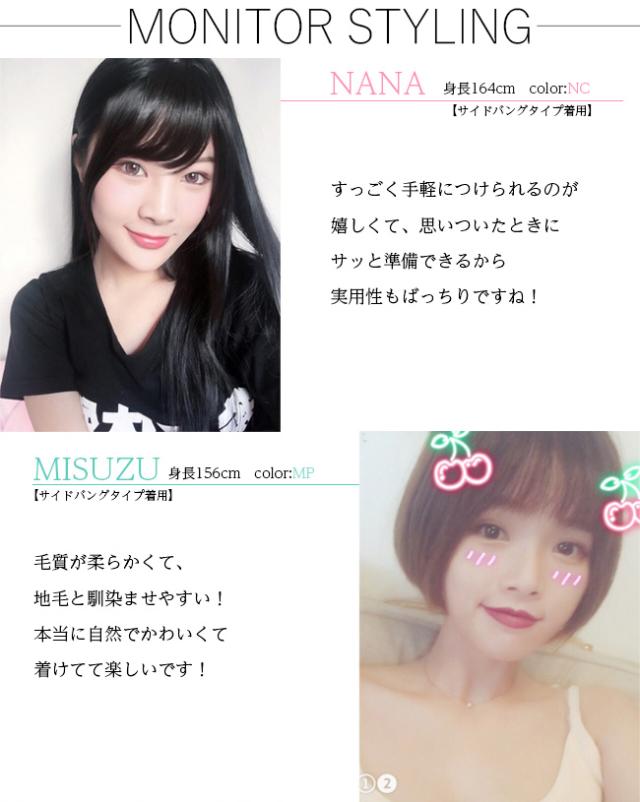 | その他 | 人気WIGが選べる2タイプに生まれ変わりました!全4色 ※写真と実物の色が、液晶の具合によって若干異なる事があることをご了承ください。 金属使用 前髪分け目自由(エアリーシースルーバング) ワンタッチクリップ(ノーマルタイプ裏側2個付き、サイドバングタイプ裏側1個付き) 簡単取り付け コテ、アイロン、ドライヤー使用可能 シャンプー使用可能 |